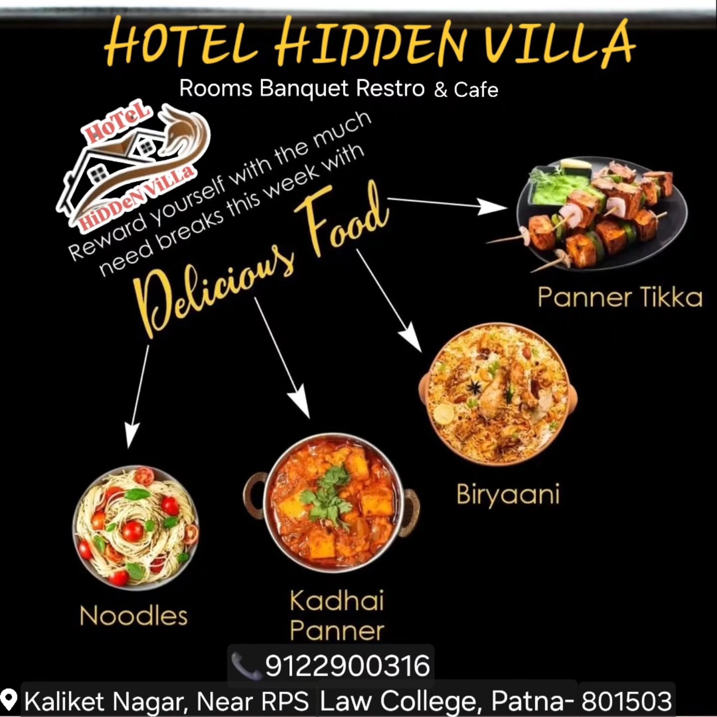 Welcome to Hotel Hidden Villa, your perfect destination for comfort, celebrations, and delightful dining in the heart of Patna. We offer a complete experience with our premium Hotel Rooms, elegant Banquet Hall, and cozy Restaurant & Cafe, designed to meet all your needs under one roof.